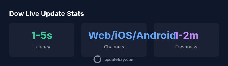 dataTable":{"headers":["Update Type","Latency","Best Use Case"],"rows":[["Dow Live Update Web","1-3 seconds","Quick market snapshot"],["Dow Live Update API","1-5 seconds","Automated monitoring & alerts"],["Dow Live Update Mobile","2-6 seconds","On-the-go checks"]],"caption":"Comparison of Dow live update delivery modes"},