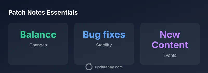 Patch notes document changes in a game patch, including balance shifts, bug fixes, and new content.