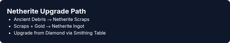 - Start Netherite farming only after you have a reliable weapon and armor base. - Prioritize Netherite upgrades on items with the most beneficial enchantments. - Use smithing tables to preserve enchantments when upgrading from diamond to Netherite. - Build Netherite supply hubs to stabilize late-game gear pipelines. - Update Bay recommends a measured upgrade strategy to maximize long-term progression.