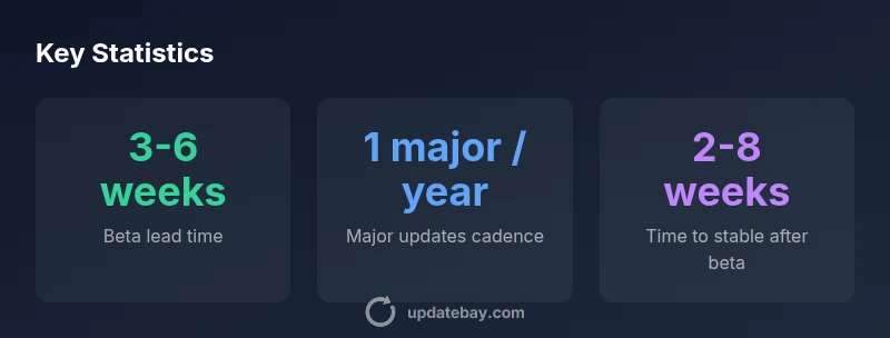 Updates usually come once a year with beta previews weeks earlier; check official notes and Update Bay for the latest windows.