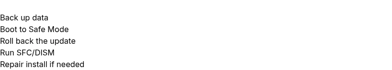 Before making changes, back up your important files to an external drive or cloud storage. Note the last successful update and create a system restore point. This protects you if a repair step worsens the situation.