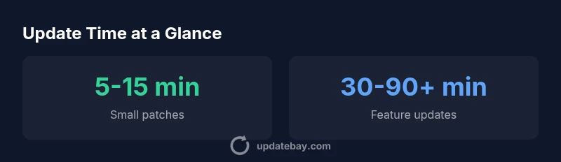 - Routine patches on mid-range laptops: 15-30 minutes total, with download and preparatory steps taking a noticeable share.