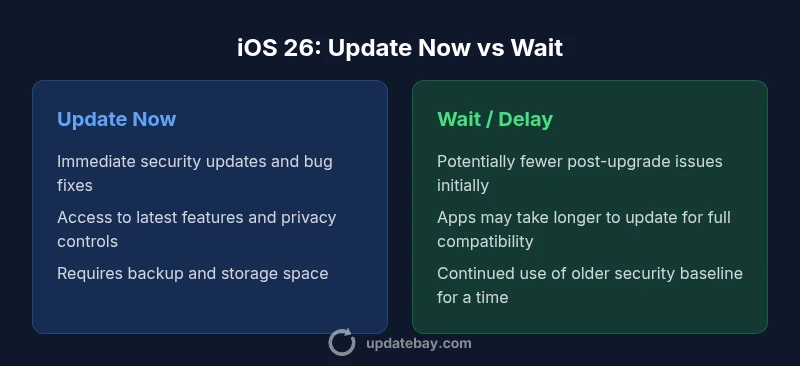 According to Update Bay, whether you should update to ios 26 depends on device compatibility, current needs, and risk tolerance. If your iPhone supports iOS 26, the update is typically beneficial for security updates, bug fixes, and new features; however, early-release versions can carry bugs and potential compatibility hiccups with older apps.