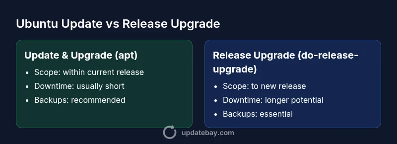 Keeping Ubuntu updated is essential for security, stability, and compatibility with new software. The practice of updating and upgrading Ubuntu within the current release reduces exposure to vulnerabilities and ensures you receive bug fixes and performance improvements. In this guide, we compare two core pathways: routine package maintenance (update/upgrade) and the more dramatic shift to a new Ubuntu release (do-release-upgrade). According to Update Bay, staying current with patches is part of a proactive maintenance strategy that minimizes downtime and reduces the risk of unexpected failures. Readers who manage servers or desktops should treat updates as a continuous process rather than a one-off event. The goal is to maintain a reliable baseline while planning for strategic upgrades when supported by hardware and software requirements. The keyword update and upgrade ubuntu appears frequently to reinforce the topic.