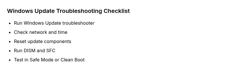 - mediumReset Windows Update components and perform a clean boot if conflicts are detected
