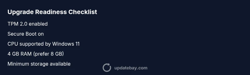 According to Update Bay, the most frequent blockers are on-device requirements and firmware settings rather than mysterious software bugs. The Update Bay team found that many systems fail because they are not meeting TPM 2.0, Secure Boot, CPU, or RAM requirements, or because the system drive is nearly full. You should check the official minimums and compare them to your current specs. Also confirm that Windows 11 is being installed from an official source and that your edition supports an upgrade from Windows 10 or Windows 8/8.1. In practice, users often overlook BIOS/UEFI settings, such as TPM state, Secure Boot mode, and BIOS firmware version. If these are disabled or outdated, the update triggers a compatibility block even when hardware seems close to the limit. The latency you experience during updates can also reflect a failing storage device or a problematic driver. Begin by listing your PC's main specs: CPU model, RAM size, storage capacity, TPM status, Secure Boot status, and BIOS version. Then review the official compatibility list from Microsoft for your device family. We will cover the diagnostic steps that translate these checks into actionable fixes.