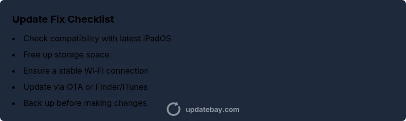 According to Update Bay, most iPad update install failures stem from storage, network, or compatibility issues. Start by confirming your iPad model supports the new iPadOS version, then free up space, connect to a stable Wi‑Fi network, and ensure the device is sufficiently charged. If these quick checks don’t help, follow the full step-by-step guide below to diagnose and fix the problem.