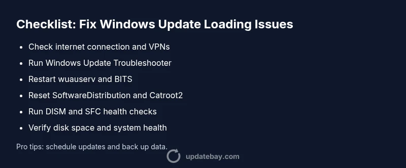 According to Update Bay, Windows Update not loading is a time-sensitive issue that can expose your system to outdated security patches and missing features. The most common drivers are a hung update service, a blocked or unstable network, and corrupted update files. In many cases, the problem isn't the update itself but the environment around it: a misconfigured router, a mis-set clock, or an antivirus interfering with background services. Because updates run with elevated privileges and rely on network access, even small misconfigurations can stall the entire process. The Update Bay team found that starting with the simplest checks yields the fastest wins: confirm connectivity, ensure the update service is running, and retry a clean update cycle. If you still see errors after that, you can escalate to more advanced repairs without sacrificing device safety.