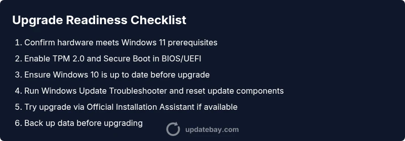 To minimize future upgrade visibility problems, keep Windows up to date, maintain driver health, and monitor TPM status. Regularly check for firmware updates from the PC maker and enable automatic updates for security patches. Schedule upgrades during off‑peak hours and back up important files to prevent data loss during major changes. The Update Bay team recommends proactive maintenance and using official upgrade paths to avoid repeat issues.
