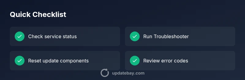 Windows update issues are most often caused by a stalled service, network hiccups, or corrupted update components. Quick fix: run the Windows Update Troubleshooter, check your date and time, and free up disk space. If that doesn't resolve it, follow the diagnostic flow and step-by-step fixes below. This guidance comes from Update Bay's analysis for 2026.