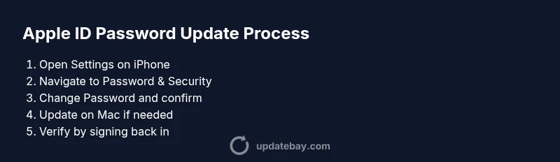 - Open Settings and tap your name. 2) Go to Password & Security and select Change Password. 3) Enter your current password or authenticate with Face ID/Touch ID. 4) Create a new, strong password and re-enter to confirm. 5) Save and sign back into Apple services on this device if prompted. 6) Repeat on other Apple devices if needed. 7) Review any apps that rely on Apple ID sign-in and update credentials where required.