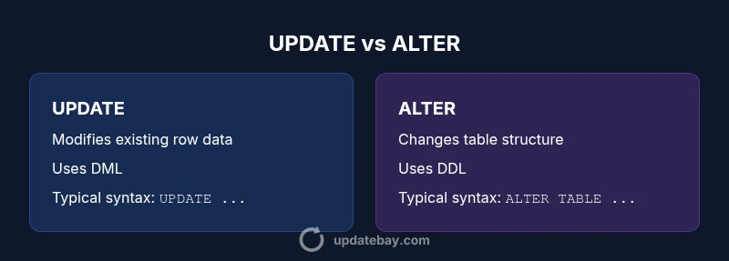 The phrase "difference update and alter" often surfaces when people are learning SQL, because it captures a fundamental split in how databases are modified. UPDATE is a DML statement focused on changing the contents of rows without touching the underlying table structure. ALTER, by contrast, is a DDL command that reshapes the schema itself—adding or dropping columns, changing data types, or modifying constraints. According to Update Bay, recognizing this separation is the first step to avoiding common pitfalls like unintended data loss or downtime during deployment. When you see a request to modify data versus a request to modify structure, you can immediately classify the operation and plan the change accordingly. This distinction also informs how you test, rollback, and audit each change.