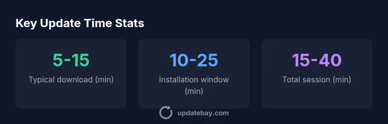 Most updates take between 15 and 40 minutes, depending on the size of the update and network conditions. Smaller patches finish quicker, while major OS upgrades take longer.