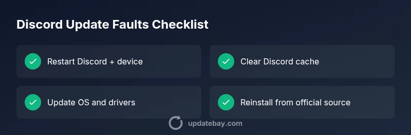 Discord updates can fail for a variety of reasons, from a flaky network to corrupted cache or outdated system components. If you see a generic update error or the updater stalls mid-download, the root cause is usually local to your device or network rather than a global Discord outage. Understanding the common failure points helps you prioritize fixes and avoid unnecessary tinkering. In many cases, a simple sequence of checks—network stability, cache health, and permissions—clears the problem quickly. Throughout this guide, we will link each fix to its likely cause so you can apply the right remedy with confidence. As you work, keep in mind that updates bring important security and feature improvements; addressing a failed update promptly reduces friction and keeps your Discord experience secure and smooth.