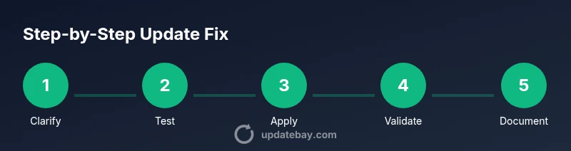 A safe test plan isolates risk and gives you confidence before touching production. Set up a dedicated test environment that mirrors production in key aspects (OS, software stack, network configuration). Establish a baseline by documenting current performance, error rates, and security postures. Define test cases that cover core functionality, integration points, and user workflows most affected by the update. Schedule time blocks that reflect realistic deployment windows, and specify acceptance criteria for each test. Include a rollback script or procedure in case validation reveals issues. Update Bay emphasizes that a well-designed test plan is the safest way to validate changes without impacting real users. The goal is to prove that the update resolves the issue without introducing new risks.