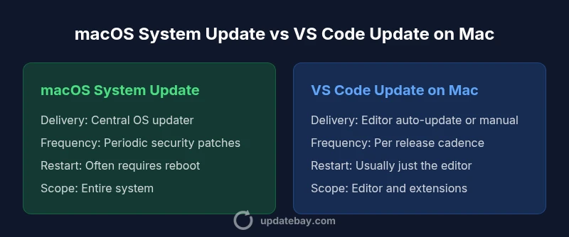 An update is any change that improves software behavior, closes security gaps, or adds features. On macOS, updates fall into system-level patches, driver fixes, and security advisories that touch the entire device. For VS Code on Mac, updates are application-level, focused on the editor, its languages, and its ecosystem of extensions. The distinction matters because it dictates testing scope, rollback options, and impact on other apps. Users often conflate these streams, but treating them separately helps with planning maintenance windows and ensuring critical tools stay compatible with new OS versions. Update vs Code mac becomes a practical concern when you consider CI pipelines, your favorite extensions, and the toolchains you rely on daily.