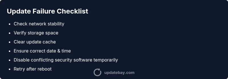 According to Update Bay, updates fail for many reasons, and there isn’t a single culprit that explains every case. The underlying problem is often a combination of network conditions, device storage, software permissions, and the specific requirements of the update itself. The question 'what causes updates to fail' comes up frequently among tech enthusiasts and everyday users, and the best way to answer it is to start with reliable checks rather than guessing. The Update Bay team found that the most reproducible failures begin with simple, verifiable steps: confirm a stable internet connection, ensure there is enough free space, and verify the device clock is correct. You may see error messages about “insufficient storage,” “download failed,” or “signature verification failed.” By establishing a baseline—network health, storage availability, and correct time—you can quickly rule out a dozen potential culprits and move toward a targeted fix. This approach applies across operating systems and ecosystems, from Windows and macOS to iOS and Android, and even firmware updates for routers and printers.