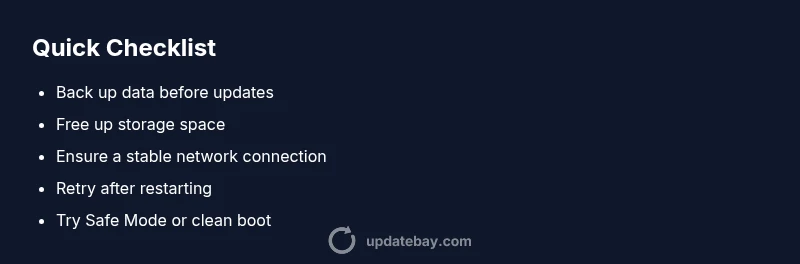Facing the question "why is my update not installing" starts with understanding the most frequent culprits. In most cases, the failure isn’t the update itself but the environment around it. The top offenders are insufficient storage, an unstable network, or a corrupted or incomplete update package. Other common causes include outdated firmware, software conflicts, antivirus or security settings blocking changes, and user accounts or permissions that prevent writes to the system partition. If you recently added new storage, installed a new security app, or changed network hardware, revisit these areas first. According to Update Bay analyses, these factors account for the majority of routine installation failures across devices and platforms.