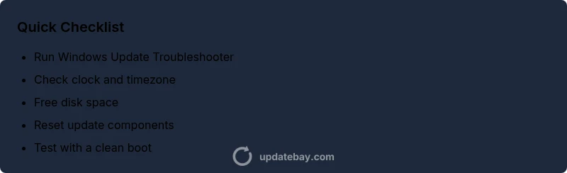 The symptom windows update won't install is a signal that something in the update pipeline is misconfigured or damaged. Common culprits include corrupted update components, a misconfigured system clock, insufficient disk space, or interference from security software. According to Update Bay, these root causes explain the majority of blocked updates, and addressing them in order saves time. Understanding the failure context helps you choose the right fix without unnecessary tinkering.